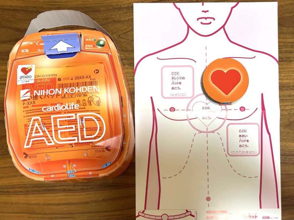 なんと、AED大手の日本光電さんとコラボした本物そっくりのAED。