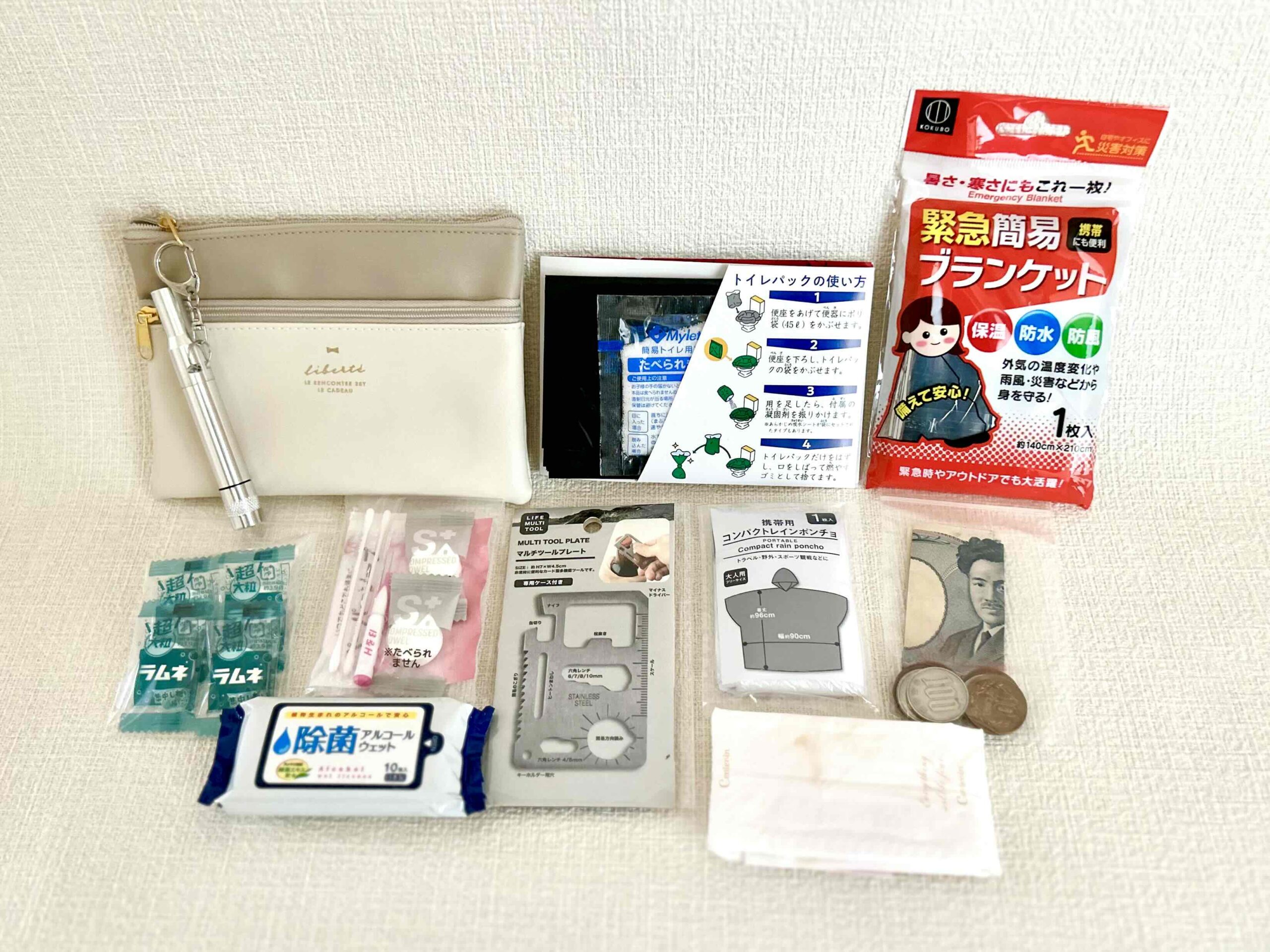 ポーチ、非常用ホイッスル、携帯トイレ、エマージェンシーシート、現金(千円札1枚、100円玉5枚、10円玉5枚)、レインコート、サニタリー用品、マルチツールプレート、衛生用品(絆創膏、綿棒、歯間ブラシ、水で戻るタオル、紙石鹸)、除菌シート、お菓子