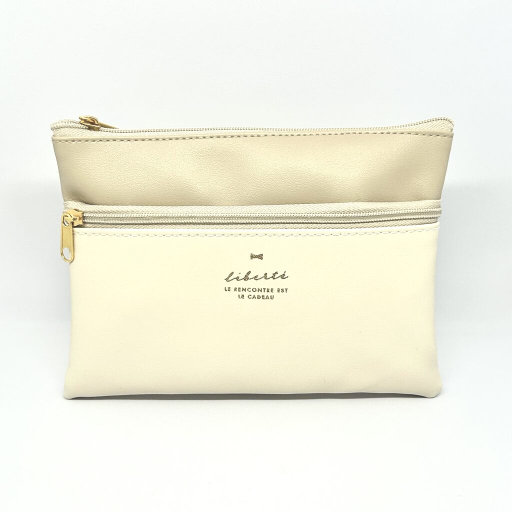 ▽ダブルファスナーポーチ/サイズ約120×170mm/アイボリーとベージュのバイカラーが大人っぽい、コンパクトなポーチ。ファスナー部分が大きく、幅のあるものでも出し入れしやすく使い勝手◎。